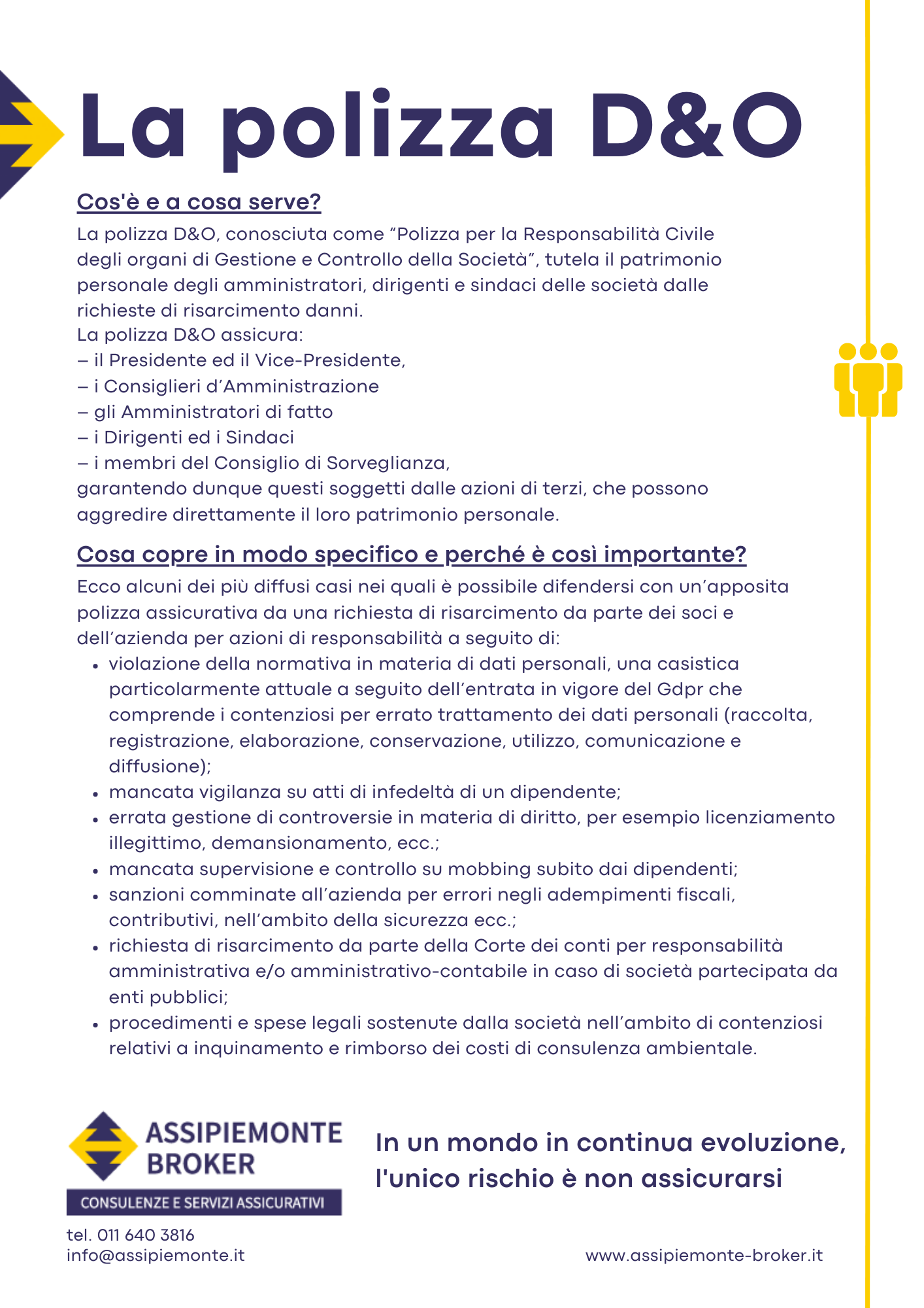 Questa polizza permette alle Piccole e Medie Imprese di tutelare il patrimonio personale di amministratori, direttori e procuratori nei casi in cui vengano coinvolti in un eventuale richiesta di risarcimento danni, cosa che in passato veniva fatta solo nelle grandi società. Al giorno d’oggi, data l’attuale complessità del mondo del lavoro, è sempre più frequente che gli amministratori e i manager d’azienda siano sempre più esposti a contenziosi di vario genere, col rischio pertanto di rimanere personalmente coinvolti in azioni legali che vadano a colpire in modo mirato il patrimonio personale di questi ultimi.