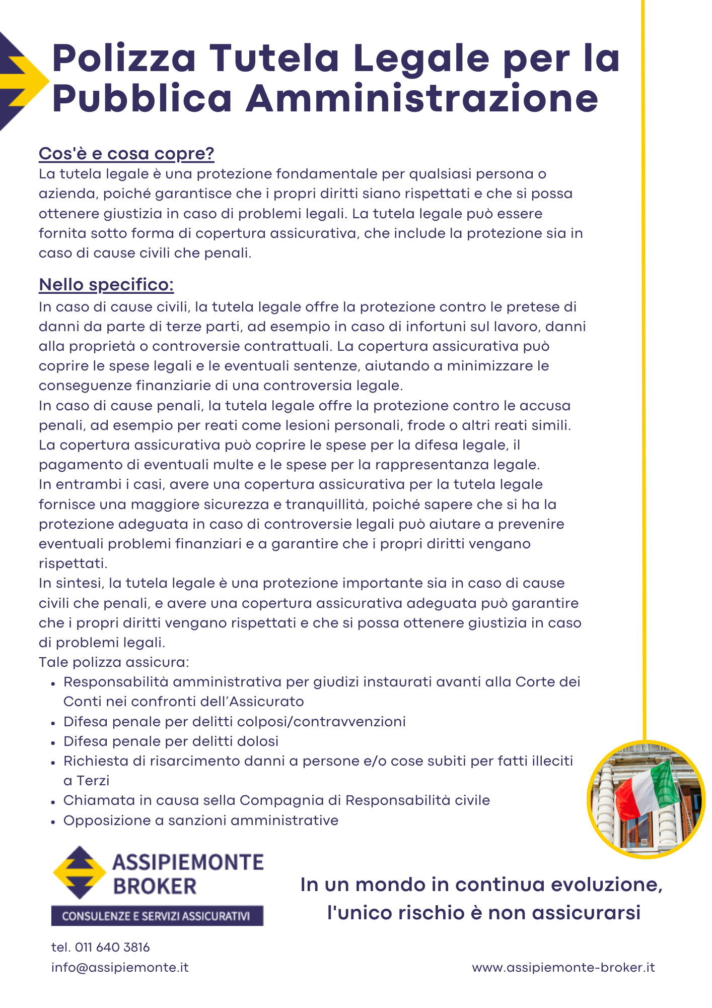 La polizza tutela legale per enti pubblici è una forma di assicurazione che offre protezione legale a enti pubblici come comuni, province, regioni, enti locali, etc. La polizza fornisce copertura per le spese legali sostenute dall’ente pubblico in caso di contenzioso o di controversie legali.